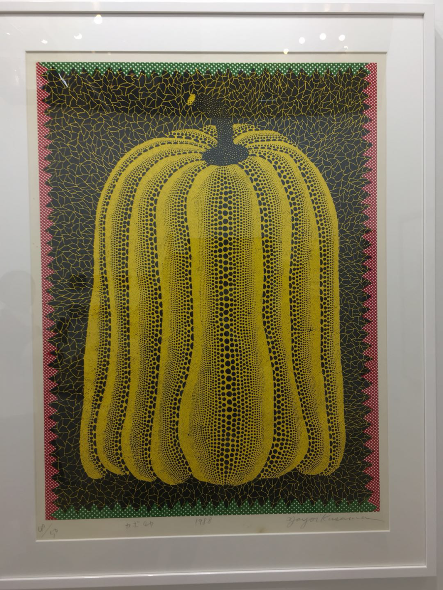 第一件是名为《南瓜》 (Pumpkin 47/50, 1988) 的丝网印刷画。画中有一个黄色的南瓜,南瓜略有变形,被拉长,趋向矩形,上面布满草间弥生标志性的波尔卡圆点(Polka dot),并带有明暗效果。背景黑色,由许多不规则的多边形填充。有四个边框,红色和绿色的锯齿状造型各两道,上面布满波尔卡圆点。