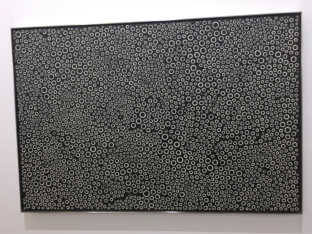 第二件作品名为《银河》(The Galaxy, 1991)。这件作品是黑白两色,纯抽象。背景是黑色,上面布满白色波尔卡圆点。圆点大小、间距错落有致,同样具有美感。同时,圆点又让人联想到太空中的星球,呼应题目,更扩大了作品的意境。